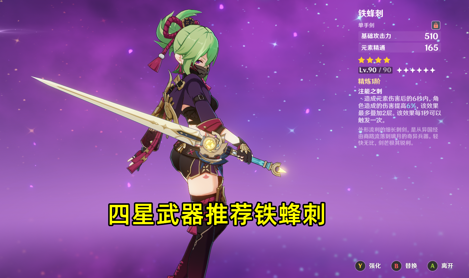 依然是优先满足生命其次精通的思路,五星首选专武圣显之钥,次选磐岩结绿和苍古自由之誓。四星武器推荐铁蜂刺和西福斯的月光,三星可选暗铁剑。和铁蜂刺面板一致的月光剑可以额外给妮露和队友提供充能,但从性价比考虑铁蜂刺即可,而且有月光剑最好优先给万叶用。