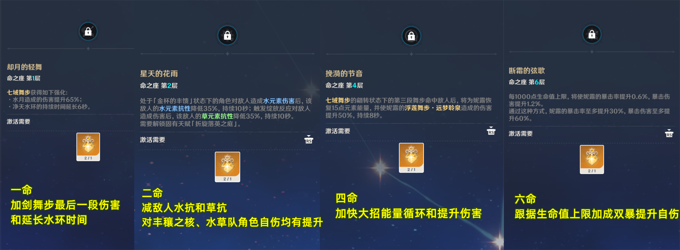 只打绽放的话,零命妮露机制已经完整。当然如果你有足够多的原石想抽命座的话,个人推荐先抽一把专武,因为专武给的属性实在太多了还能给队友加精通。其次是二命,前提同样是限定水草队,可以额外削减敌人35%的草抗和水抗,对于丰穰之核、妮露自身的水伤、还有队友的伤害均有提升。四命和六命则为妮露加强了大招循环和爆发,以及额外提升双暴面板,最终都是为妮露的自伤服务,只考虑打绽放的话二命性价比最高。