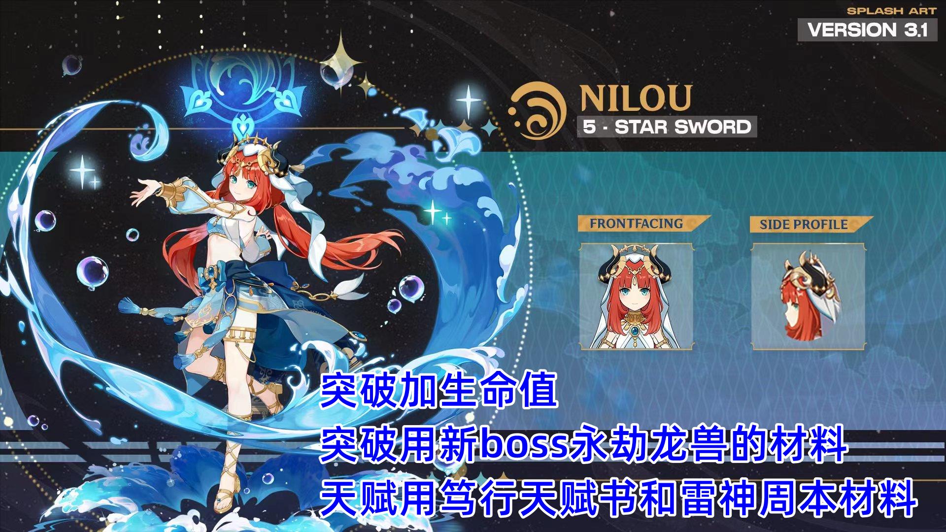 妮露详细技能和命座信息终于曝光,开篇也不说别的了直接进入正题。妮露,五星水系单手剑,满级15185生命值,230攻击力和729防御力,突破总计加28.8%生命值,因为她的技能机制均和生命有关。突破用到须弥特产帕蒂沙兰、水元素晶石、蕈兽掉落的孢囊晶尘以及3.1新地图boss“永劫龙兽”的掉落物;天赋升级用到须弥的笃行天赋书(周三/周六/周日掉落)、蕈兽掉落的孢囊晶尘以及雷神周本掉落的祸神之禊泪。