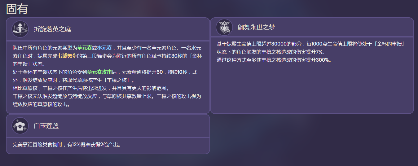 固有天赋“折旋落英之庭”,队伍中所有角色都是草系或水系,并且至少有一草一水的情况下,妮露战技的第三段舞步会给队友赋予“金杯的丰馈”状态。处于该状态下的角色受到草元素攻击后元素精通提升60点,持续10秒;另外触发绽放反应时,将生成取代草原核的“丰穰之核”。丰穰之核会迅速爆炸并且范围更大,完美解决草原核延迟爆炸的痛点。
