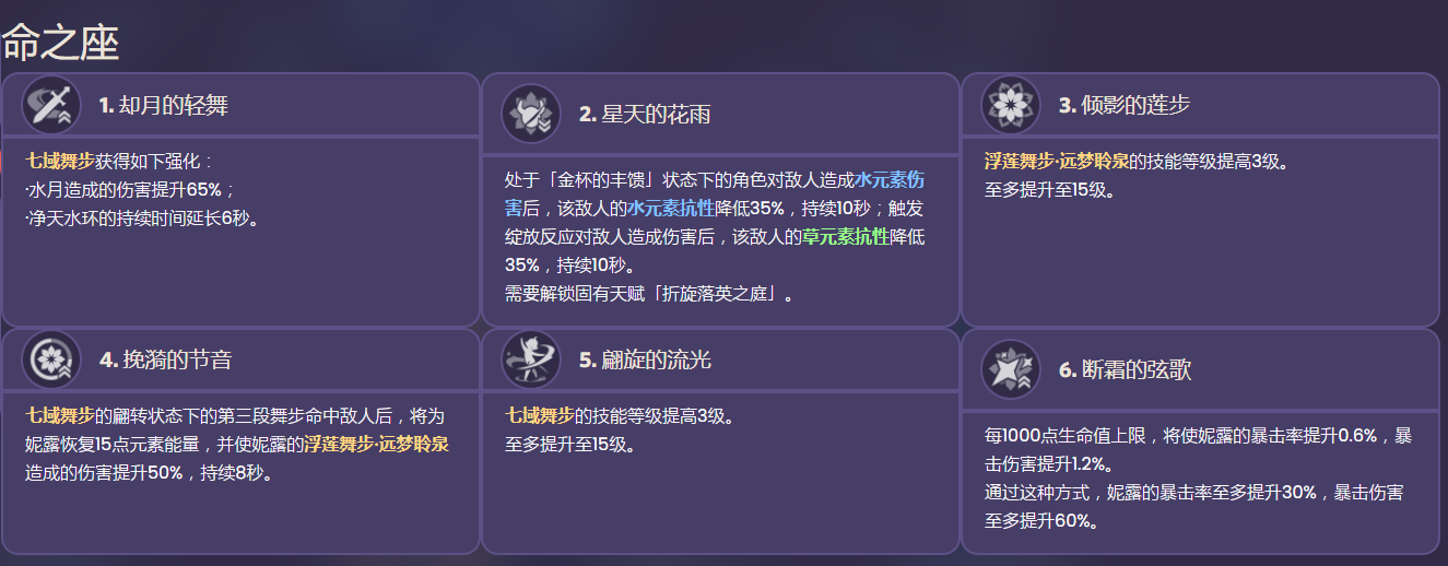 命座方面,1命加强战技,水月伤害提升65%,水环持续时间加6秒,相当于1命能做到伪无缝水环;2命处于金杯的丰馈状态的角色对敌人造成水伤,减敌人水抗35%,持续10秒;触发绽放反应则减草抗35%,持续10秒;3命加大招等级所以5命加的战技;4命是战技第三段舞步命中敌人后,为妮露恢复15点能量,并使大招伤害增加50%,持续8秒;6命是每一千点生命上限,使妮露暴击提升0.6%,爆伤提升1.2%,最多提升30%暴击率和60%爆伤。
