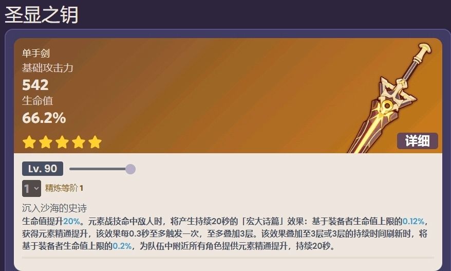 妮露专武“圣显之钥”,满级542攻击力加66.2%生命值。1精特性是生命值提升20%;元素战技命中敌人时产生buff,基于生命上限的0.12%获得元素精通,最多叠3层;叠至3层或3层的持续时间刷新后,将基于生命上限的0.2%,为全队提供元素精通提升,持续20秒。全队加精通确实挺香的,但副属性和特性都加生命值注定了不够泛用,而且不得不再次吐槽妮露专武外观真的不好看加不相配。
