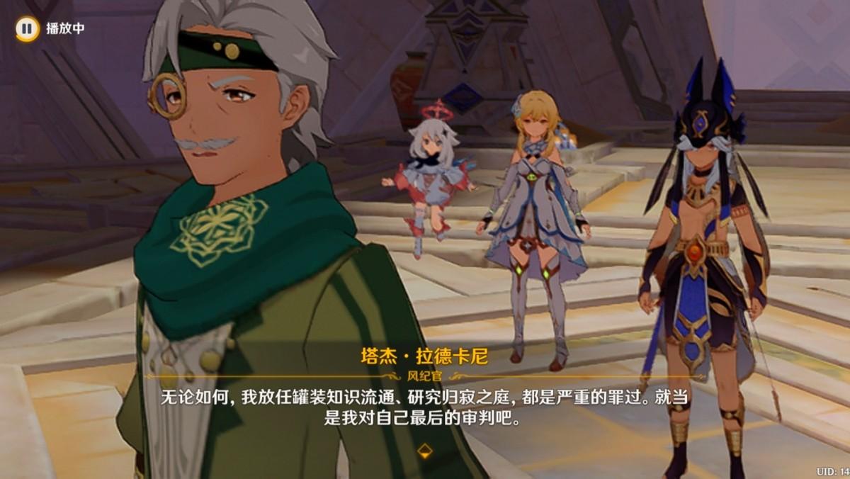 这次传说任务中,我很高兴老风纪官塔杰并没有丢失初心,比起所谓的中年失业或是亲手逼死自己的孩子,如果塔杰最终真的灰心丧志,丢失本心的话,虽能理解,但却会无比的扼腕。他为了坚守一生的职业与信念,甚至不会对自己的家人留情与通融。而事到如今,却背弃这些的话,那最为难过与难受的,只会是他本人。虽说最后的结局称不上好,但对塔杰来说,也算是最后的余热与不留遗憾了吧。而且,其信念与职责也是有继承者的,现在我很期待,未来的主线中能看到赛诺来审判那些狂妄自大,不敬神不爱民的贤者们。