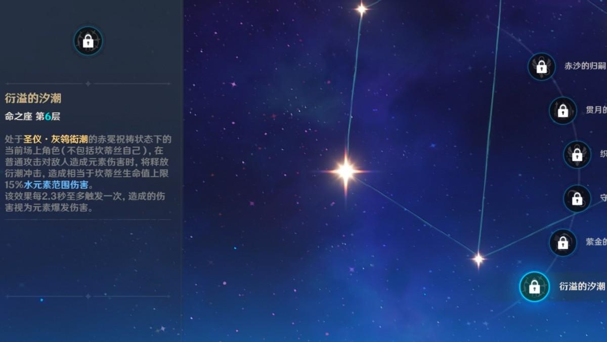 命座部分,1命大幅度优化坎蒂丝在队伍中的覆盖量。2命就差不多给队友的增伤多1%伤害,因为坎蒂丝基础生命是10000出头,20%等于多2000血,2000*0.5%=1%增伤。3 、5命:EQ+3 ,提升等级等于提高了倍率伤害。4命这个命座本质上是优化了坎蒂丝充能,虽然会多站约1.5秒于场上。6命提升了一些坎蒂丝在后台的输出量,虽不到多大量但也是个伤害,不过主要还是提升整体队伍水元素附着量。值得注意的是,除非真爱想趁现有限定up稳稳满命,不然不特别建议现在去抽甚至抽命座,毕竟3.2版后就会进入常驻池的四星。