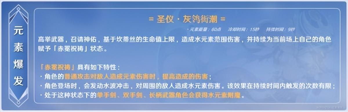 作为4星水系长柄武器角色,主要机制是实现水附魔(仅对单手剑、双手剑、长柄武器角色有效)与元素伤害型的普攻增伤(白色数字的物理伤害增不了)。自身造成的水元素伤害与普攻的增伤比例都与生命值有直接关系,而提供这两大机制的是Q,所以最简单的培养方案便是以这两大机制为主,注重生命值与充能效率培养即可。