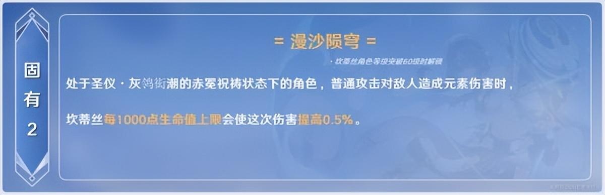 普攻增伤的比例由Q和[固有天赋·漫沙陨穹](简称“固有2”)提供,其中Q提供的比例为固定20%,固有2提供的增伤比例与坎蒂丝的生命值有关。