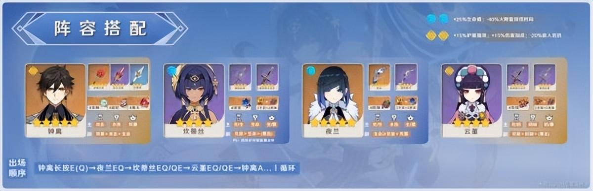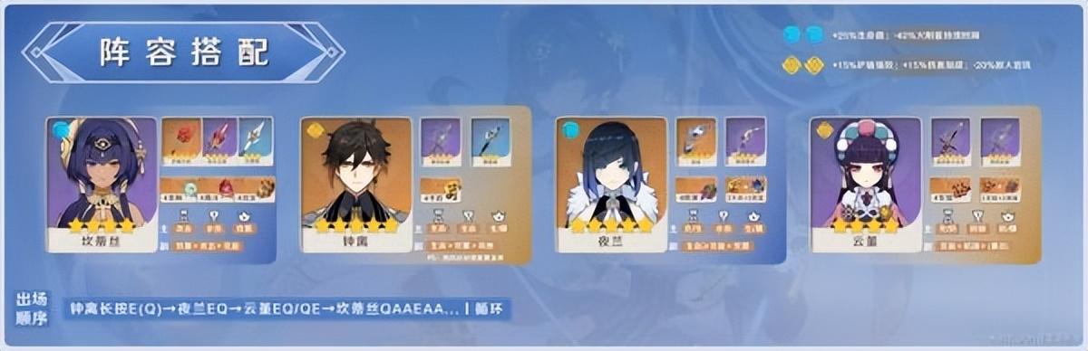该阵容与上个阵容类似,就多了夜兰的[元素伤害]乘区的增伤与后台输出,没有夜兰时可替换为行秋,2命的行秋可以减少敌人的水元素抗性,也是提升伤害的手段。
