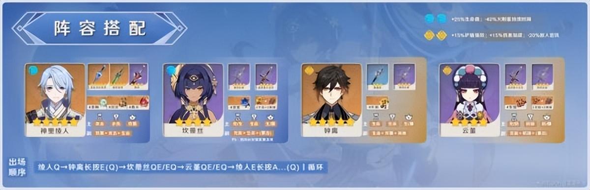 坎蒂丝带着水附魔的出现,自然不会忘了“武神流—水枪钟离”。坎蒂丝与云堇的配装同上个阵容。