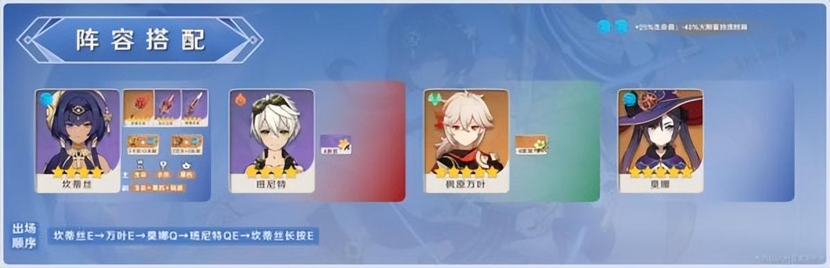 还有“国家队”【坎蒂丝+行秋+班尼特+香菱】或者【坎蒂丝+班尼特+万叶+香菱】,这些队伍都可实现坎蒂丝驻场,但整体体验下来输出环境并不友好,主要是没有抗打断,且队伍的循环能力不能做到无缝循环,主要会卡在香菱位置,需班尼特“产球”补给香菱。不过总的来说,这三个阵容提升练度也是可玩的阵容。