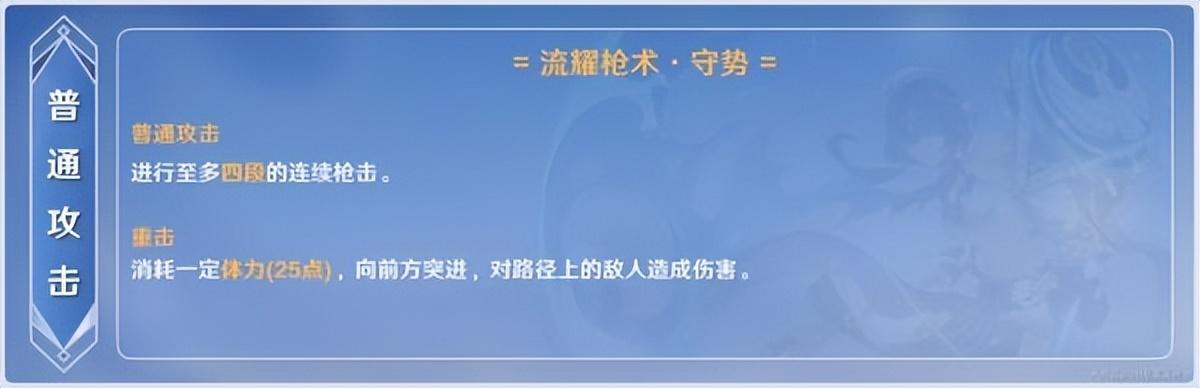 重击与其余大部分长柄角色一致,动作体现上都是稍微后撤再向前突刺,基本实战中不怎么使用。