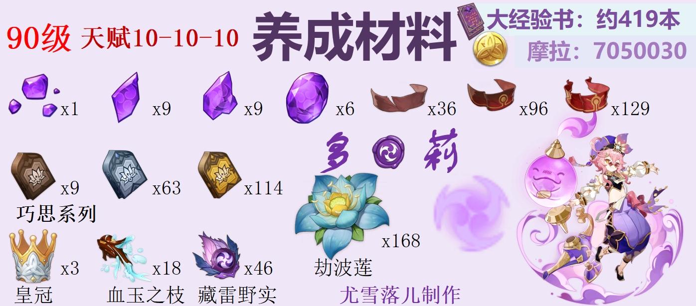 从官方发的图片可知,多莉拉满需要419本紫书、7050030摩拉、最胜紫金碎屑×1、最胜紫金断片×9、最胜紫金块×9、最胜紫金×6、褪色红绸×36、镶边红绸×96、织金红绸×129、「巧思」的教导×9、「巧思」的指引×63、「巧思」的哲学×114、劫波莲×168、智识之冕×3、血玉之枝×18、藏雷野实×46。