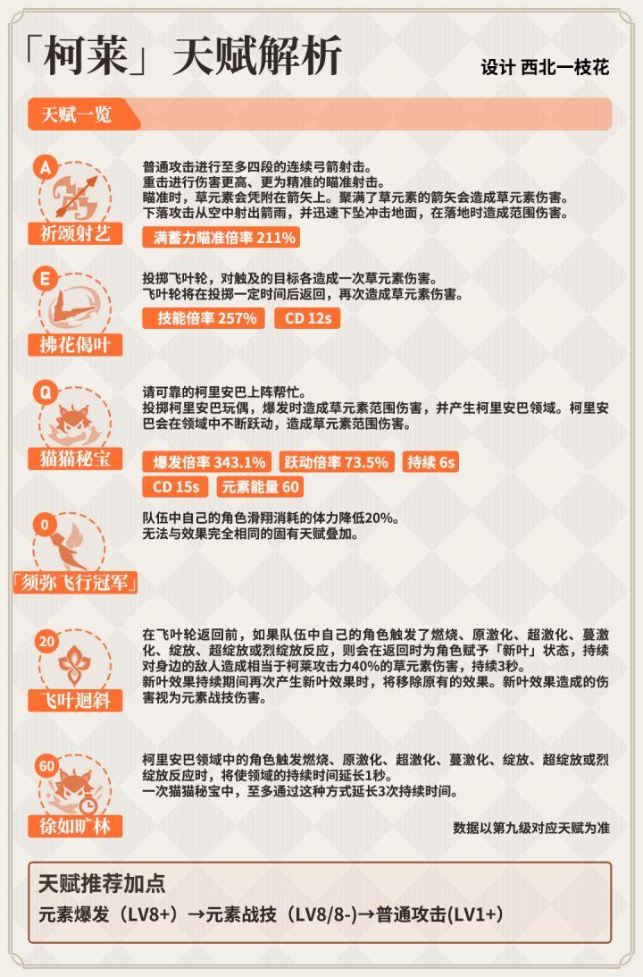 加点建议给柯莱的元素战技升级可以改变释放元素战技时候的草元素伤害。这和激化反应共同作为柯莱的主要输出手段。建议作为次要提升的技能。资源少的话6级即可,资源比较富裕可以提升至9级。