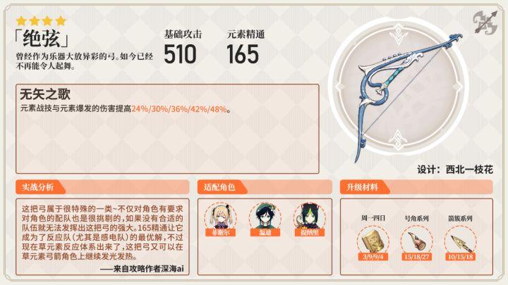 最适配柯莱的弓,和柯莱相性极高,和其他武器相比优势很大,在后台就能轻松吃满武器被动,并且提供了大量充能和精通,能让柯莱安心堆双爆,是当前版本的唯一指定毕业武器。