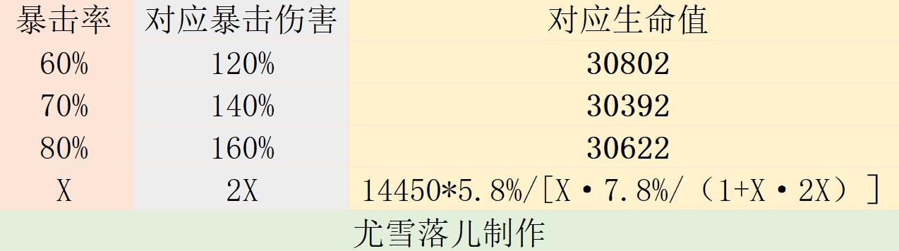 生命对于夜兰的提升非常大,我们假设夜兰暴击率60%,暴击伤害120%,生命30000,此时,如果增加一个词条,会发现,5.8%生命收益竟然大于>3.9%暴击率=7.8%暴击伤害。不说废话,暴击率、暴击伤害、生命值对应数值如下表: