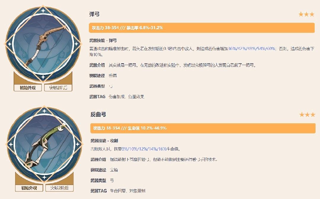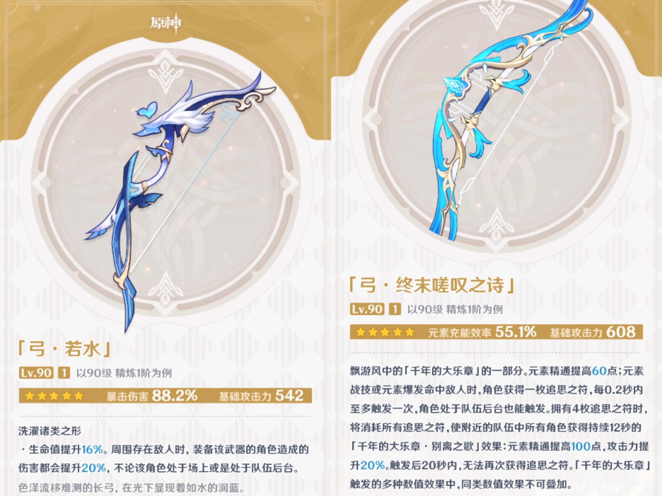 五星武器推荐若水和终末嗟叹之诗,四星武器推荐西风猎弓和祭礼弓,三星武器推荐弹弓和反曲弓。在一些吃精通的队伍里,终末>=若水,另外,绝大多数情况下,西风猎弓>祭礼弓。