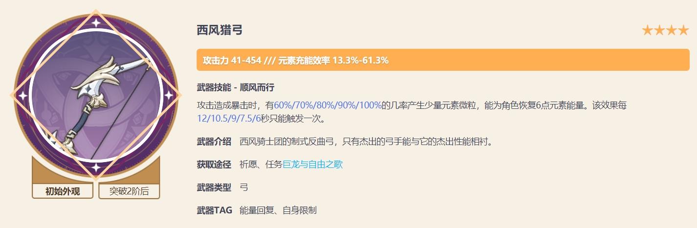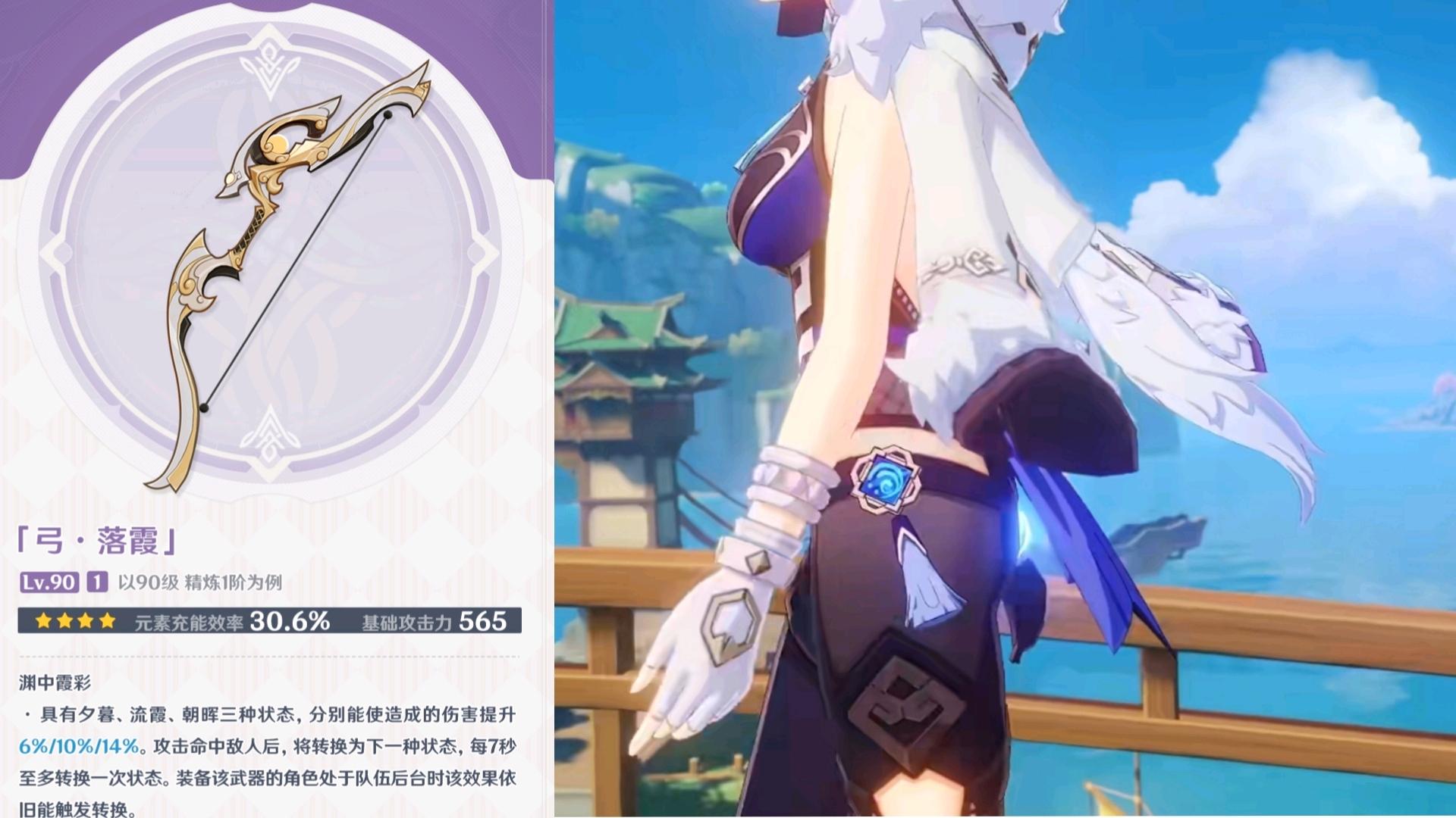 落霞:2.7版本新武器,主副词条和祭礼弓一模一样,如果没有其它好的武器,可以先用落霞过渡。落霞可以白嫖到精5,且处于后台也能触发特效,总体表现不错,是平民玩家的一个不错选择。