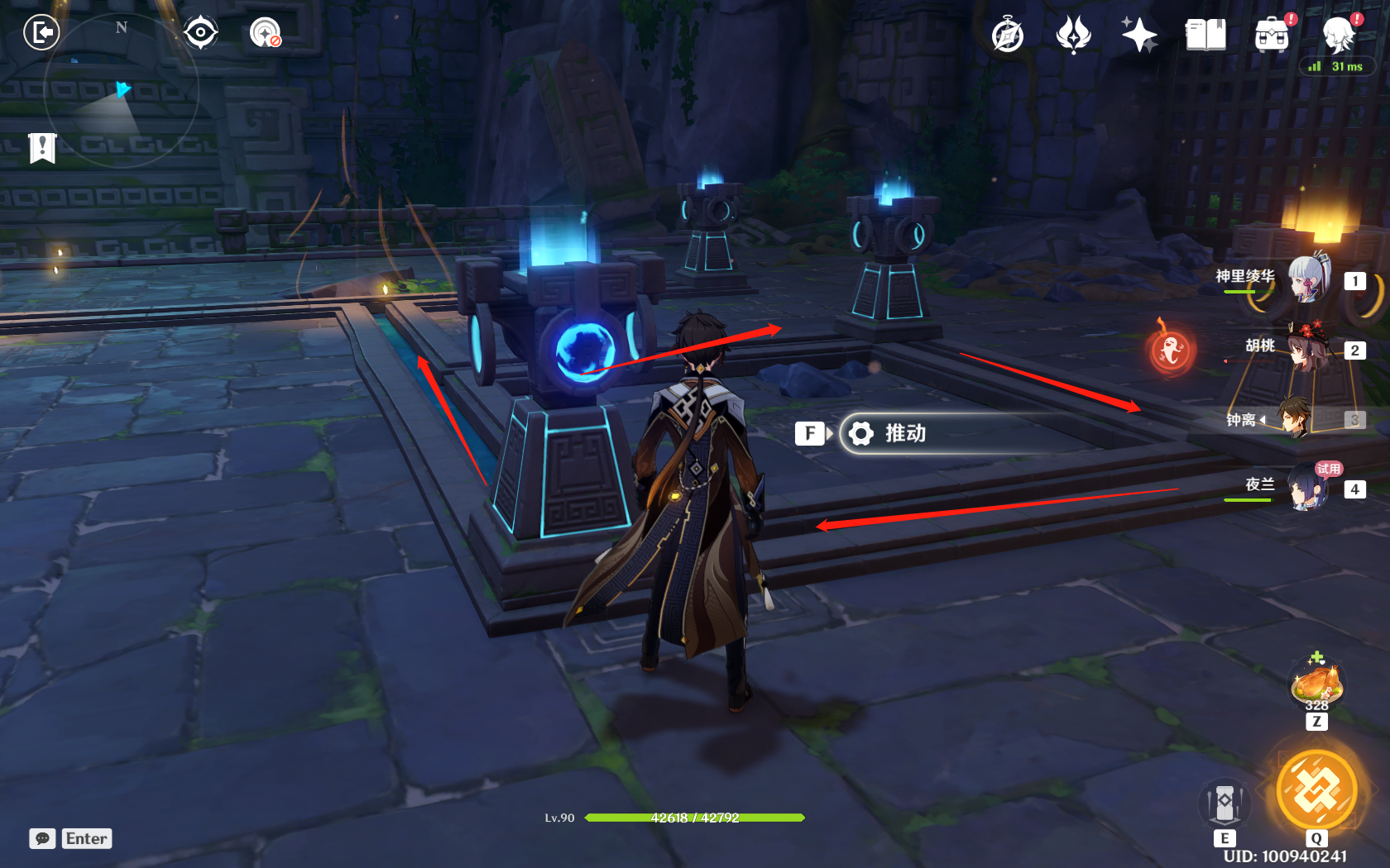 移动灯台:两处的灯都点完后,可以回到中间移动灯台了,需要将3个灯台移动到上方的光照处。最左侧的灯台按照图中路线移动即可,很简单。