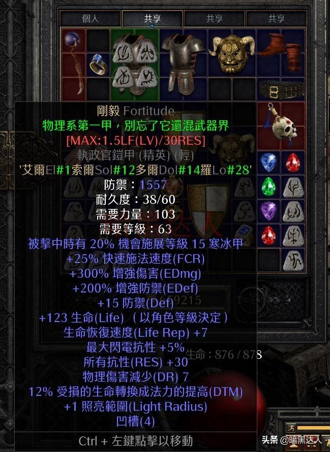不过如果你的运气不怎么好一直没有刷到用来制作“刚毅”的符文28号(罗),那么在此之前非常建议刷或者合成出一个20号符文(蓝姆),再准备一件灰色/白色品质3孔盔甲(无形更好)底材,制作一件号称穷人神甲的符文之语“背信”。