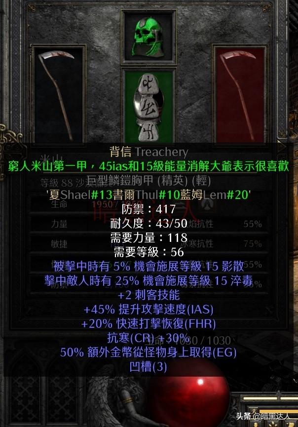 “背信”的符文镶嵌顺序为13号(夏)+10号(书尔)+20号(蓝姆),带有45%攻击速度和20%快速打击恢复属性,+2刺客技能没有任何作用也不必理会,它能被称作神甲的原因就是带有超高的攻速属性和“被击中5%机会施展等级15能量消解(影散)”被动触发效果。