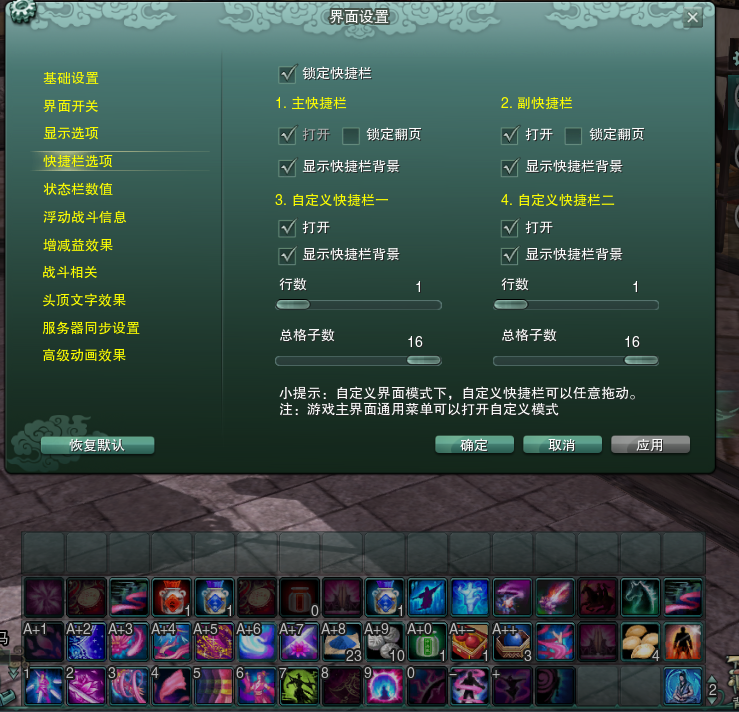 接下来看快捷栏,最多是可以设置4个的目前,足够大家使用了,最下方的两排可以通过右侧的箭头来切换,所以通常这2排是用来放技能的,一个心法用两行差不多,然后如果是pvp与pve都玩的玩家,又都是双心法的,4个也刚好够用。
