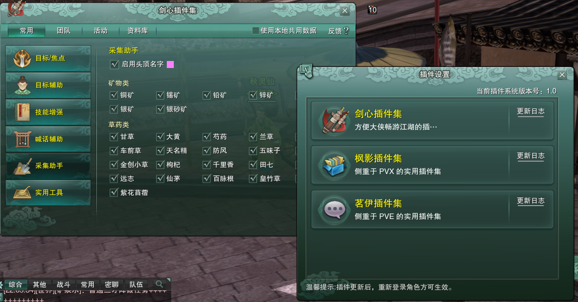 现在说下插件,没下载的可以在角色界面下载一下,这个是官方允许并且推荐使用的,不是脚本,大家可以放心大胆地用。剑心插件这边目标焦点那边方便找npc,采集助手这边头顶名字很实用,尤其是在绿地里采草药时。