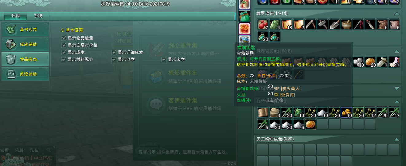 枫影插件的物品信息很实用,可以告诉大家这个物品的成本,来源等信息。可惜交易所信息没办法获取到目前最低价,不然会更好用了,可以马上算出某个道具是否有利润。茗伊插件对于打团本各种统计很有用,这个就不具体说了。