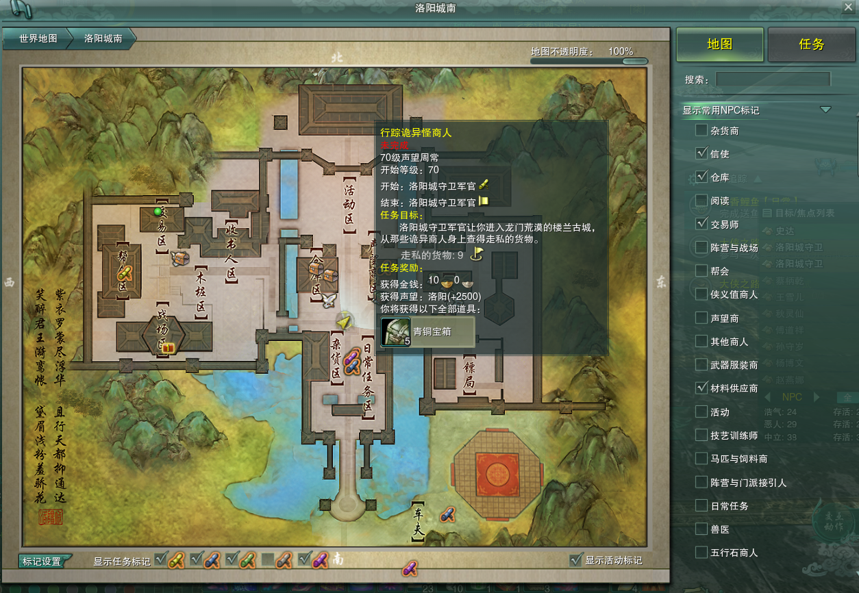 在地图上,蓝色的为日常或者周常任务,紫色的则为活动任务,这边门派日常也算活动任务,金色的则是一次性任务。