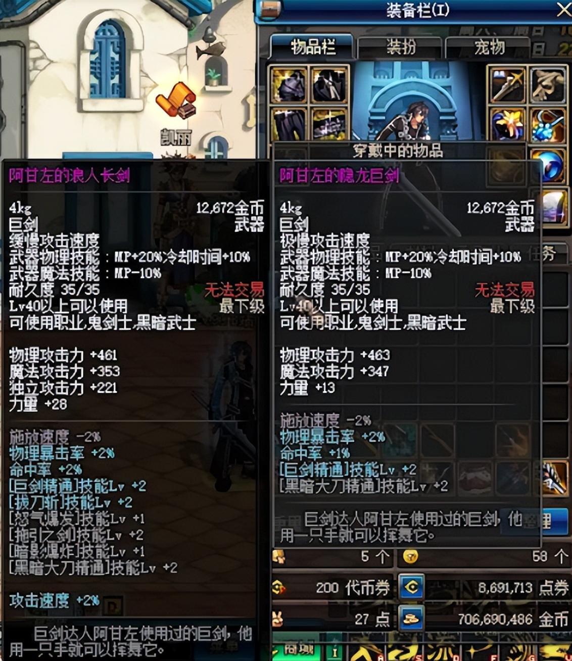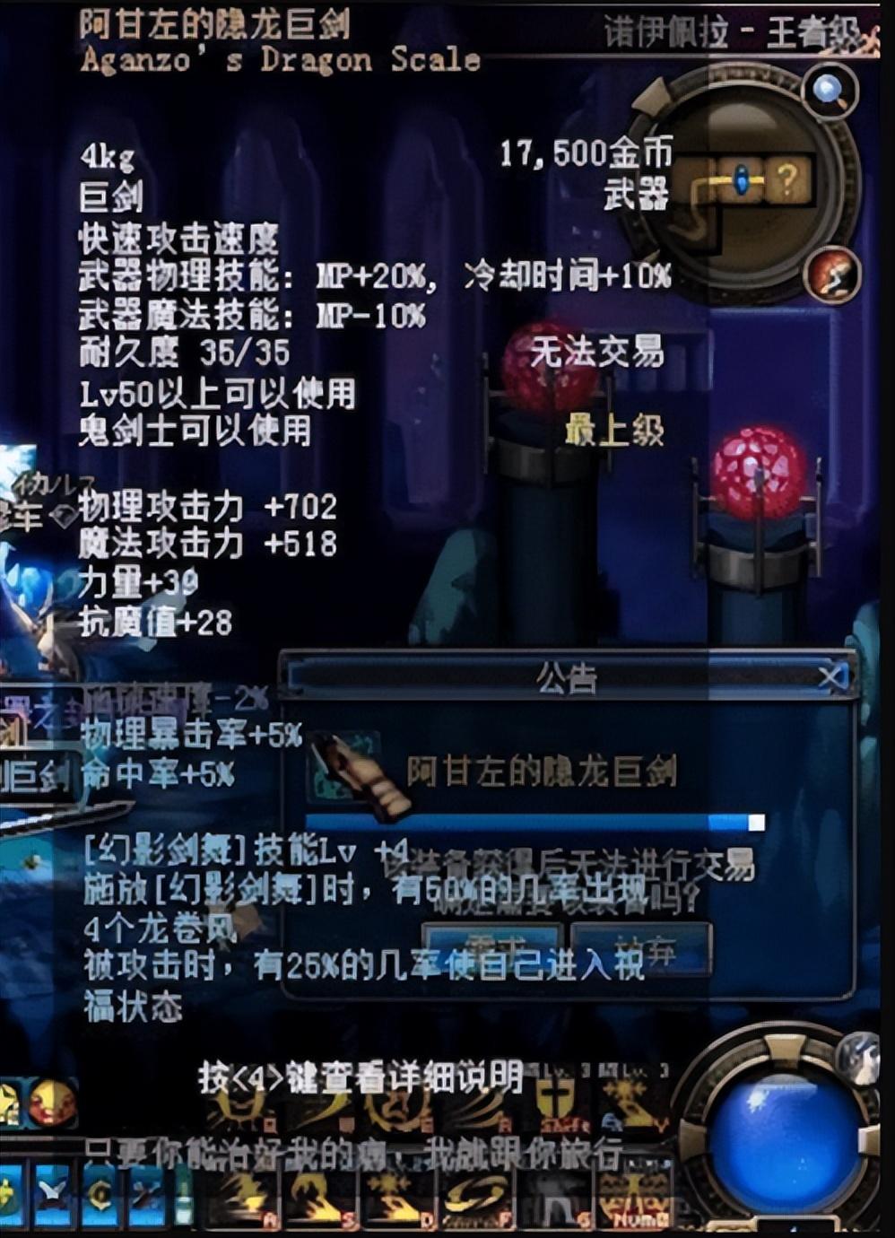 虽然在地下城中确实是有阿甘左的隐龙巨剑这把武器的存在,但这却和传说中的史诗武器不同,这是一把40级的粉装武器。其属性和史诗级的隐龙巨剑根本就比不了,这怕不是阿甘左遗弃的武器吧。