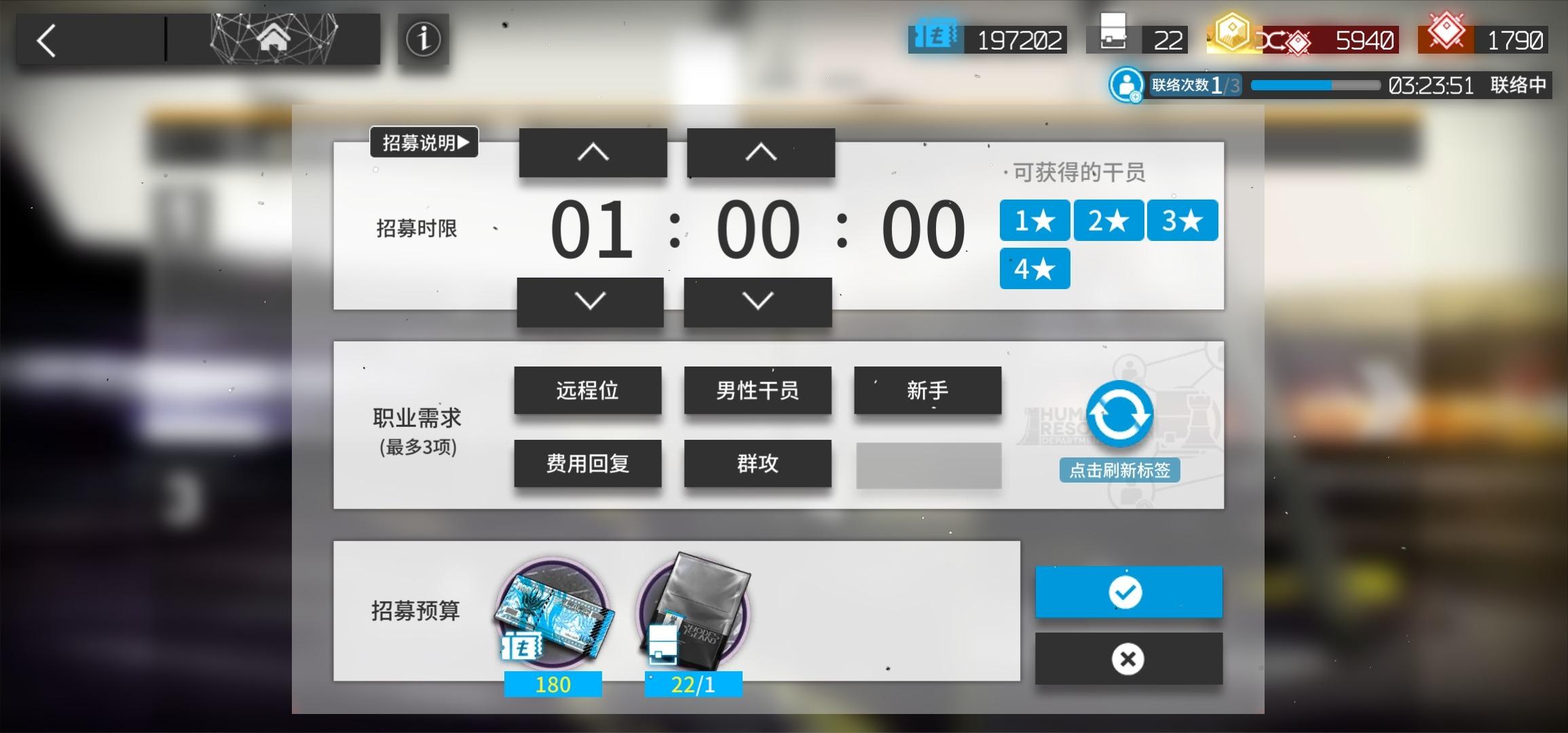 怎么办呢?首先提升自己的基建等级!提升到三级以后可以建造人力办公室,这个人力办公室工作完成一次可以就为博士们提供三次联络人脉的机会!三四联络人脉的机会用在哪里?用在我们的公开招募!不是们都应该清楚,除了卡池抽卡以外,我们干员最多来源就是公开招募。