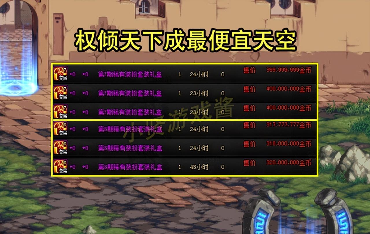 第6套天空套天光云影套是极具仙侠气息,富有高贵感的天空,目前拍卖数量比天1还少,只有1套,售价更是高达8亿,由于男女鬼剑士是为剑魂、剑帝量身定制的,因此人气才会这么高,但8亿还是略贵了些。
