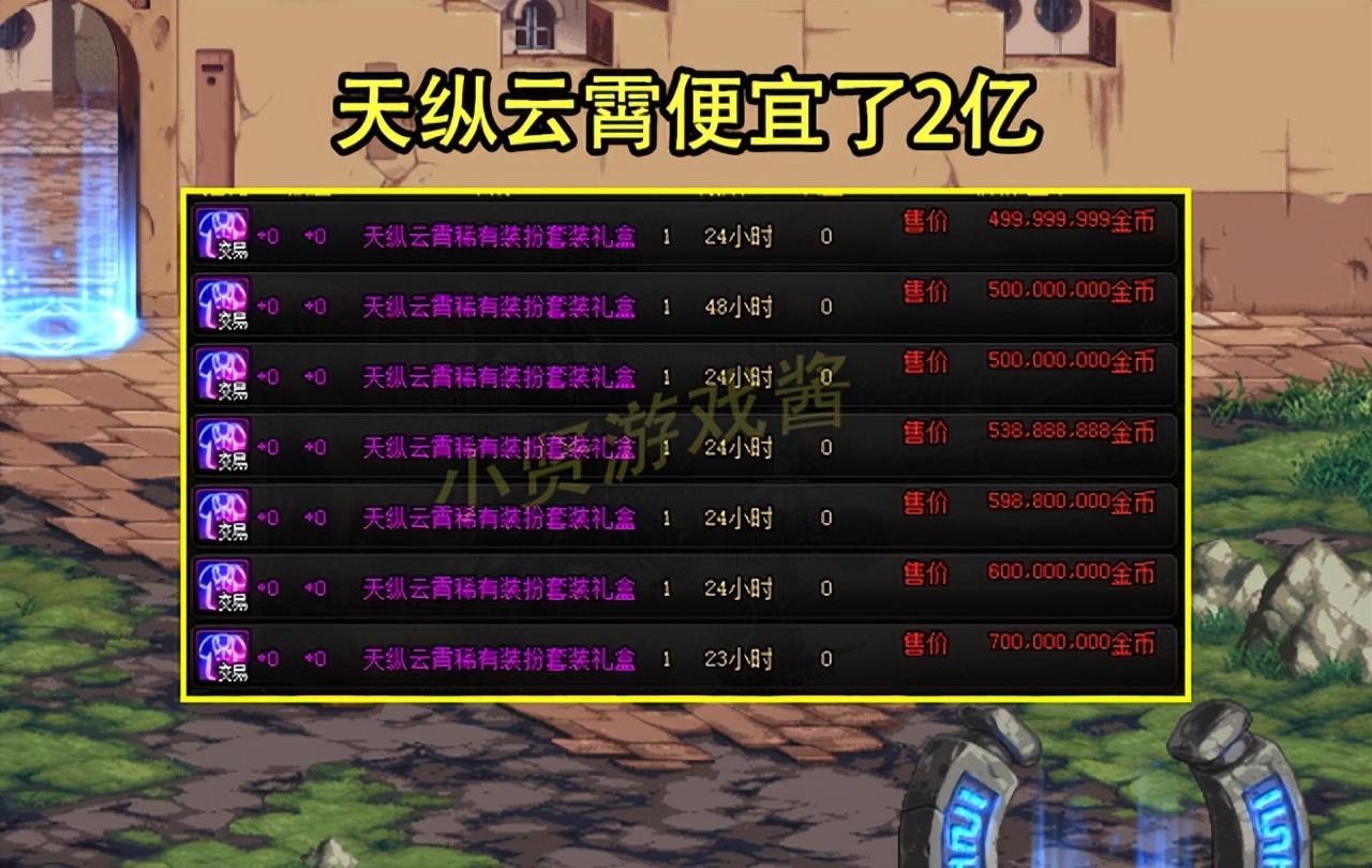 天纵云霄套的价格挺让人意外的,第一次加入缝纫机的时候,价格直接对标天1,售价高达7亿多,目前仅需5亿就可以购买的。之所以便宜这么多,是因为第2次加入就不值钱了,况且天纵在缝纫机还可以开启账绑的,几率有0.5%,自己开或许更划算。