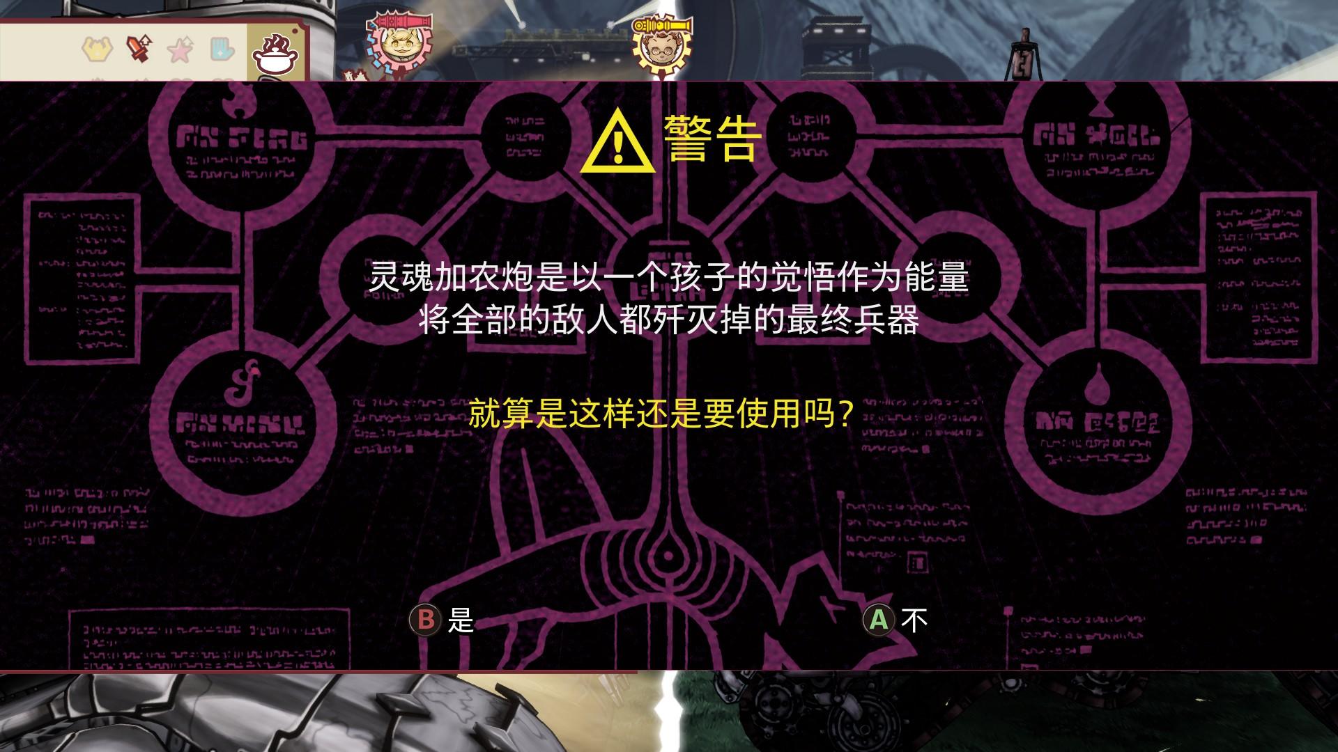 游戏在宣传时还有另一个让人侧目的要素——“灵魂加农炮”。这个是在BOSS战中塔拉尼斯判定你即将落败的时候会启动的终极兵器,只需要一击就能够扫平一切敌人。但代价也非常惨痛,那就是牺牲一个小朋友的生命。虽然在正式开始游戏之前就已经不自觉地对灵魂加农炮的存在产生了戒备,但说实话,除了使用灵魂加农炮的那个教程之外我个人再也没有遇见过需要用到它的情况。