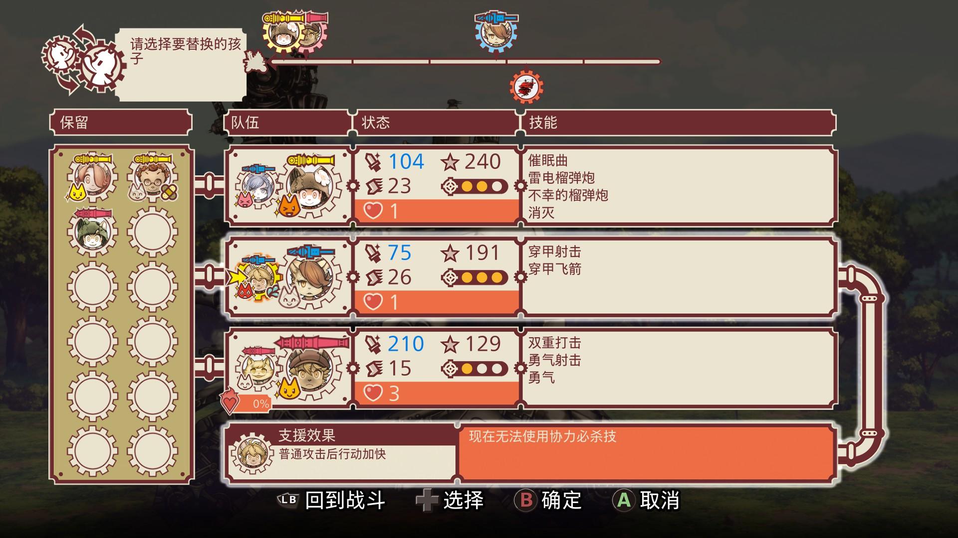游戏的上手十分容易,只需要驾驶战车“塔拉尼斯”沿着路线不断前进就可以。一些地方会有路线分歧,这些分歧只和战斗难度有关。在进入中场休息点的时候能够开始AVG部分,每次都能够自由分配20点AP,你可以选择做饭、升级战车,或者直接选一只小动物让它与另一只小动物对话来增加好感,好感到一定程度的时候两只小动物会出羁绊事件的小剧场。根据中场休息时的选择,在之后的战斗中也会出现或多或少的影响。比如汉娜作为辅助的时候普通攻击能够回复HP,好感度高的时候回复的HP量也会越高。