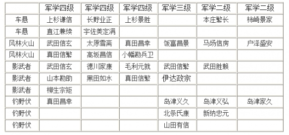 6、[风林火山],合战特技,提升军团的所有陆军部队攻击力、防御力、移动力,军学越高,持续时间越长。只有军团长能使用。