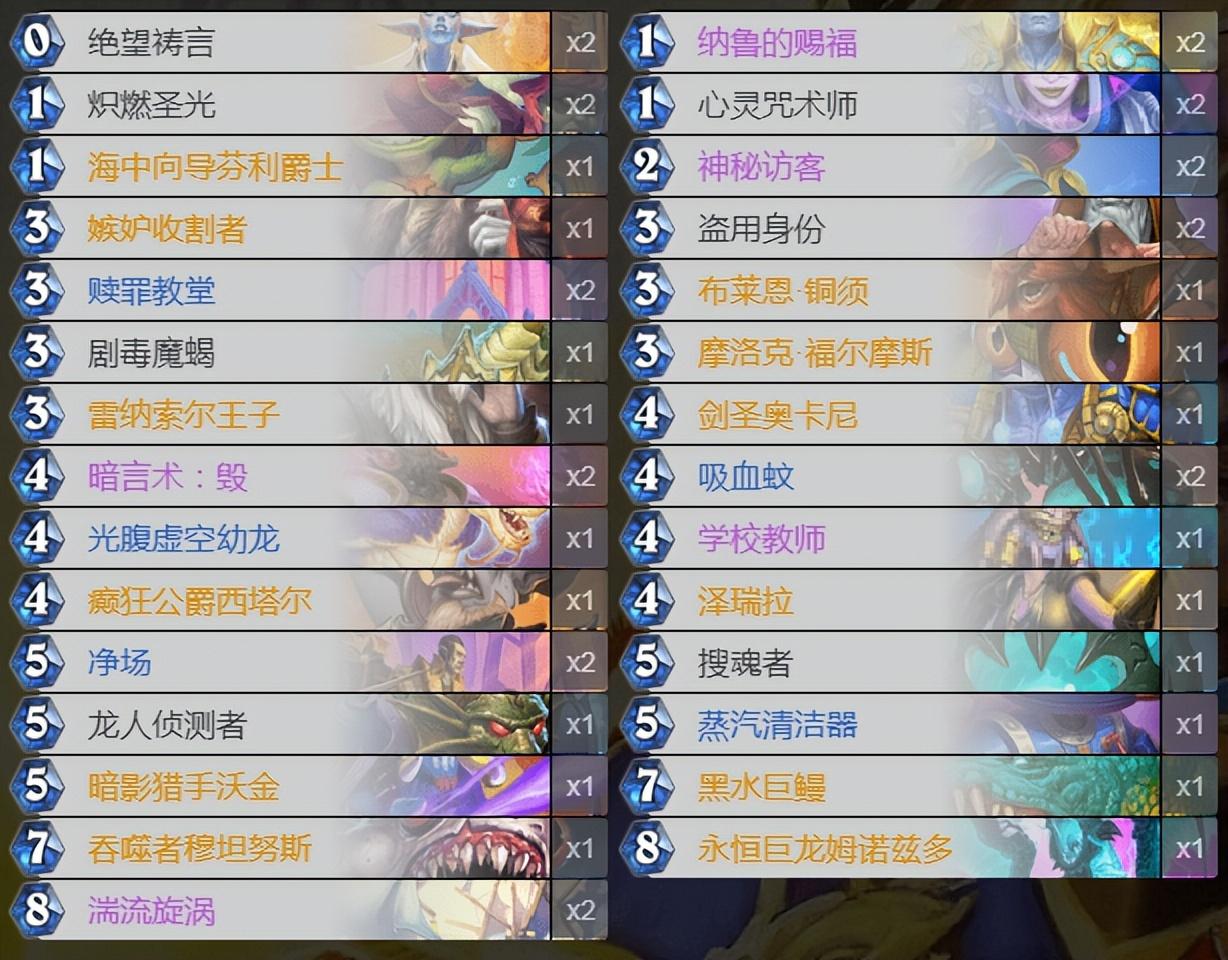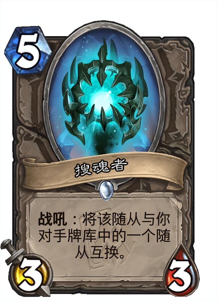 这套卡组之所以比之前更好玩是因为搜魂者的加入,这张5费3/3的卡能直接和对手牌库中的一个随从互换,作为打断对手核心资源的卡牌来说还是相当管用的,效果强势而且节奏稳定,在打小德、战士、法师以及骑士等构筑的时候都有很不错的效果。