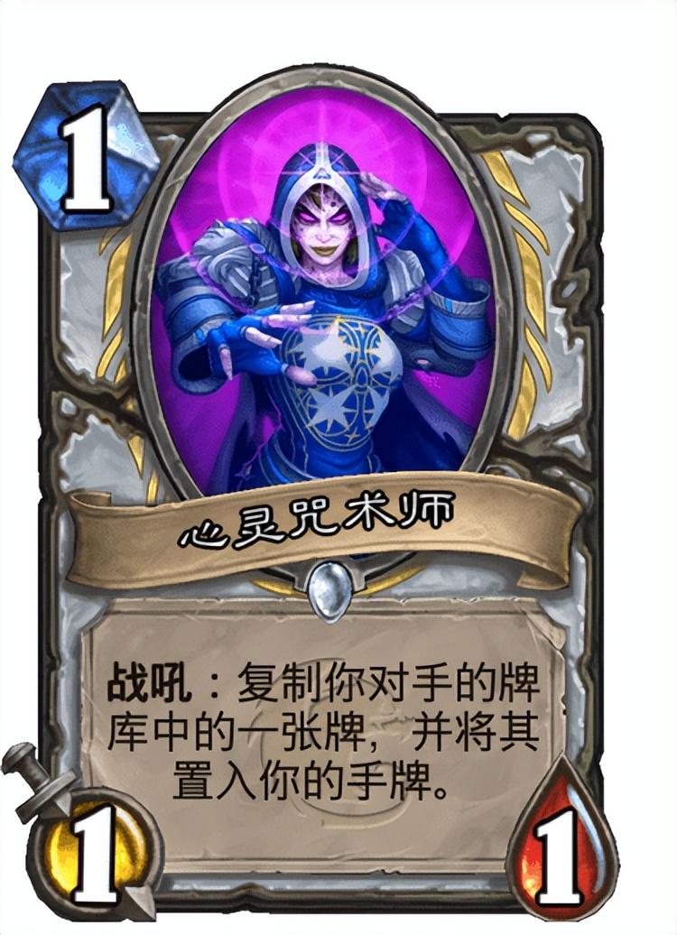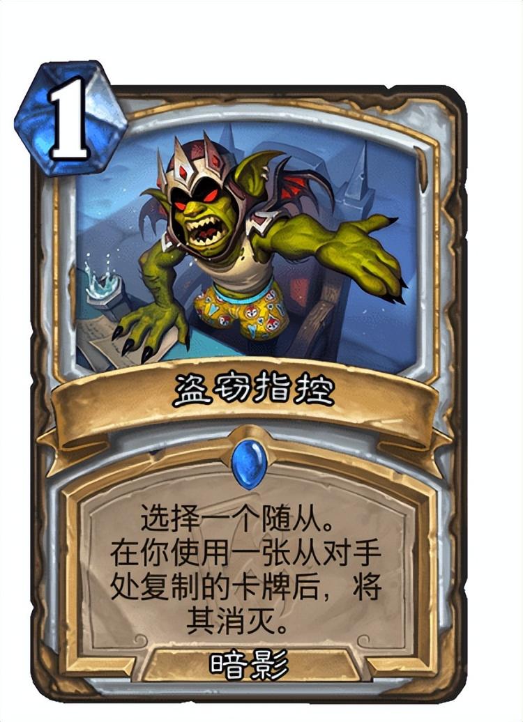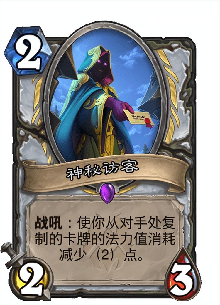 这套卡组的偷牌手段还是比较多的,像心灵咒术师、盗用身份等卡牌都可以复制对手的卡牌为自己所用,如果前期偷牌居多的话可以试着配合神秘访客来使用,这张卡的战吼效果可以让你从对手处复制的卡牌法力值消耗减少2点,如果配合铜须的话说不定能让这些减费卡牌配合你的场面打出一波大节奏。