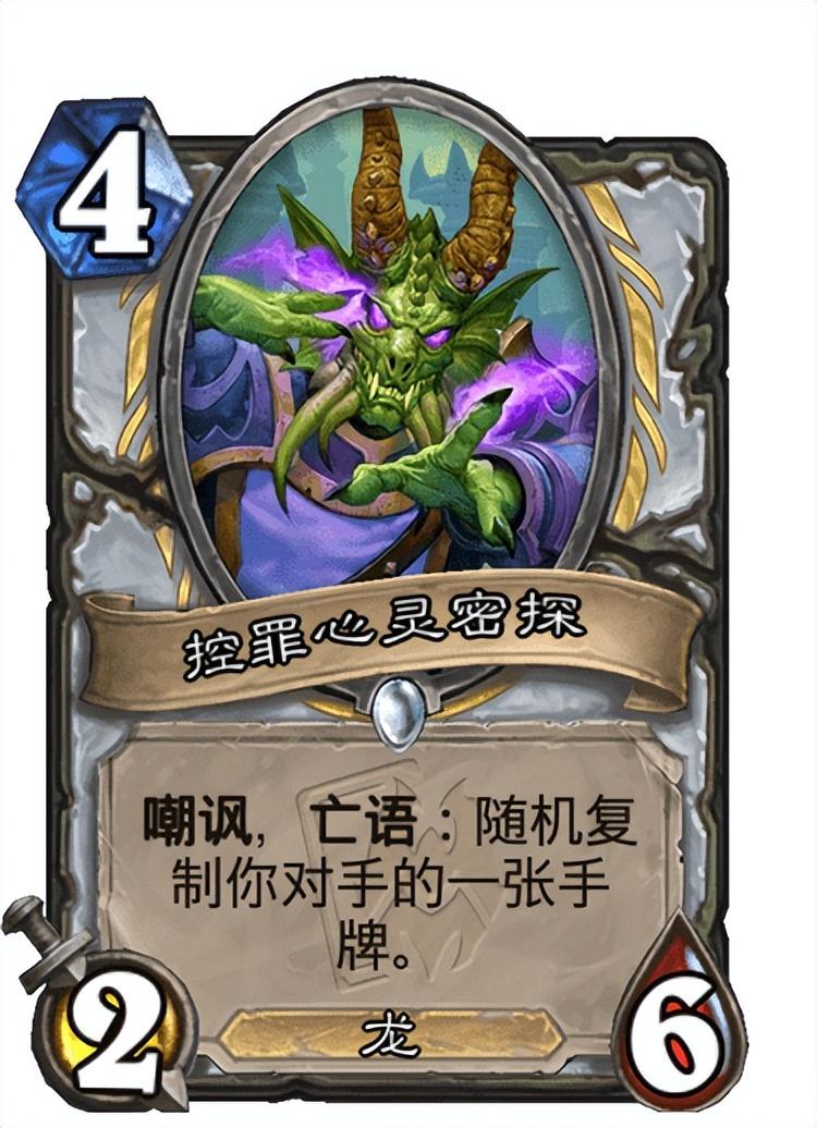 同时控罪心灵密探这张卡也能作为偷牌核心加入到构筑中,替换的话可以替换掉吸血蚊来打一手防御节奏,本身426的身材就相当完美,而且嘲讽亡语的效果还能复制对手一张手牌,对于偷偷体系来说还是很有帮助的。目前试了好几把发现控罪心灵密探的上限更高,所以大家可以直接选择替换,新卡讲道理还是有点东西的。