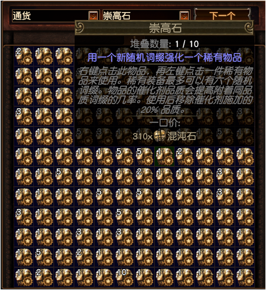 这款游戏的交易是自由的,东西全是靠刷图刷出来的,主要靠通货互相交换来交易,主流通货叫混沌石,爆率一般,常见。然后是崇高石,爆率极低,比较珍贵。两个各有不同功能的石头。如果你手里有了这两种石头,随时可以通过线下方式找其他人交易。