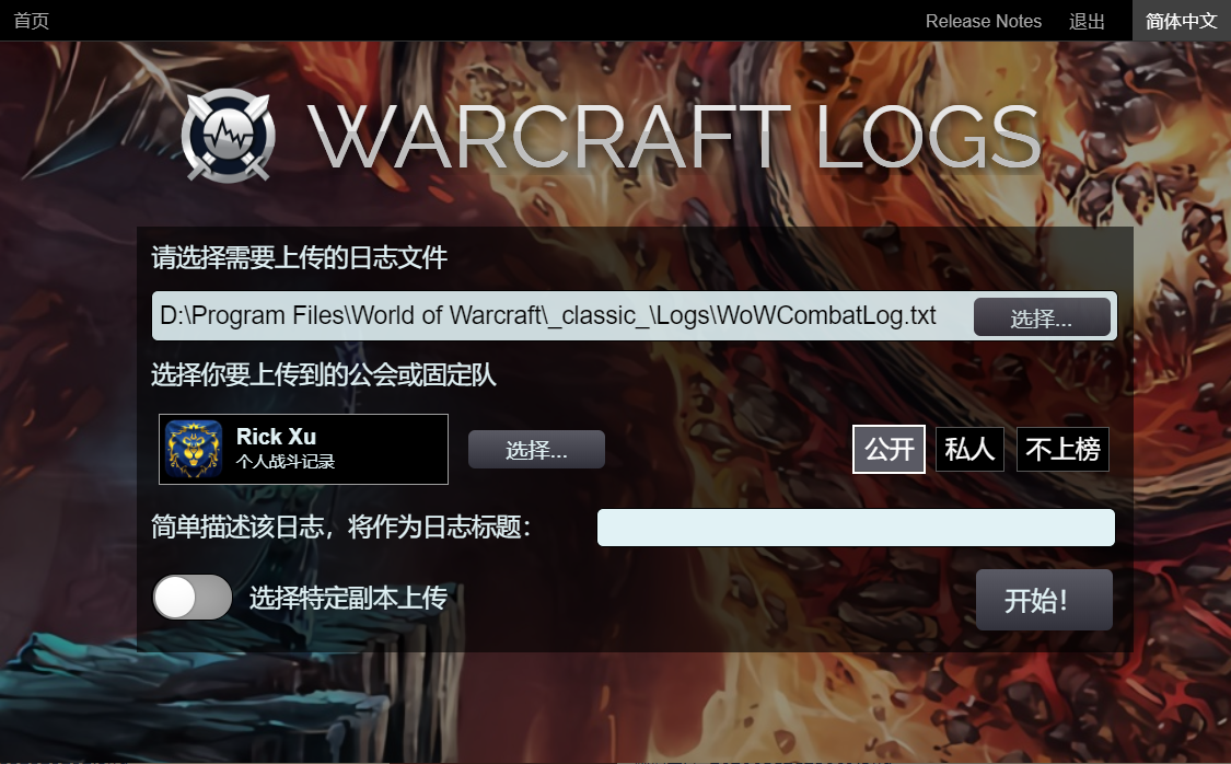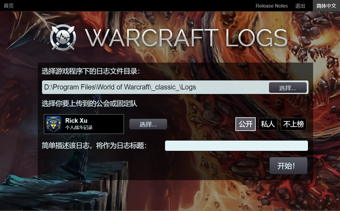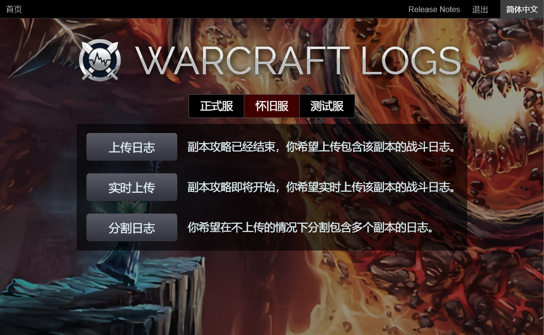打开第步下载的wcl上传工具,登录,选择怀旧服,我们能看到上传日志/实时上传/分割日志三个按钮。