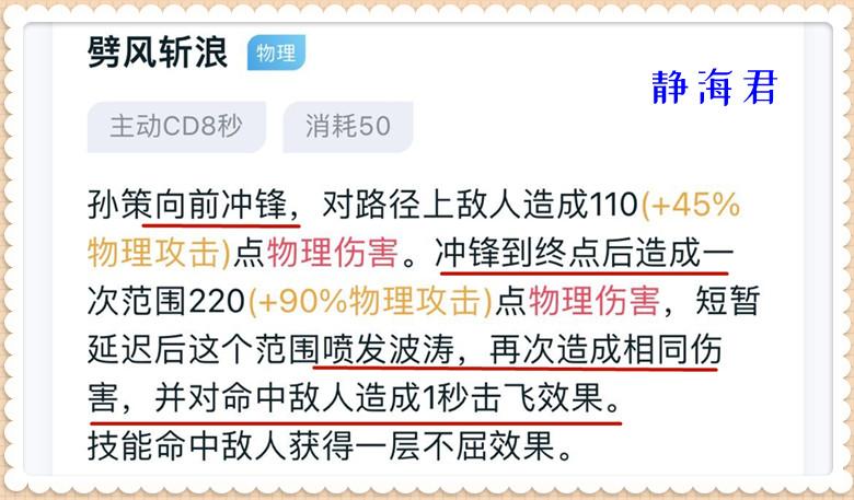 孙策的一技能非常好理解,就是一技能位移过去造成伤害,经过短暂延时后,技能终点会再出现一次伤害(和第一次伤害相同),造成伤害的同时还会击飞命中的目标。