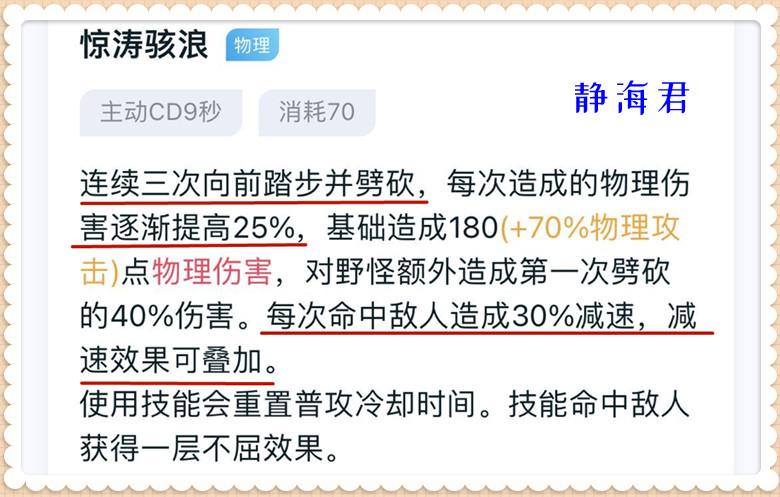每次劈砍在命中目标后都会造成其30%的减速,并且这个减速效果还可以叠加。另外二技能最厉害的地方是可以立刻重置普攻时间,这一点在实战中很关键。