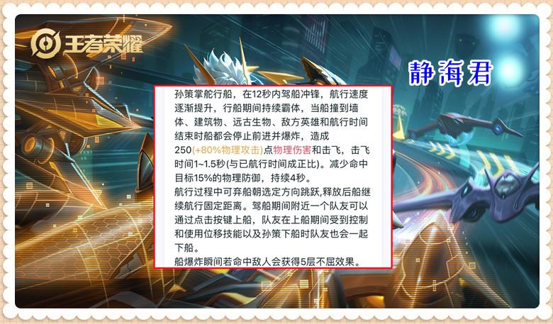 孙策开大期间会处于霸体状态,并且随着时间的推移,孙策大招的速度会逐渐变快。当大招撞到墙体、敌方英雄或者大招持续时间结束(自己结束)后,孙策的船/马会爆炸,并对技能范围内的单位造成伤害和击飞。