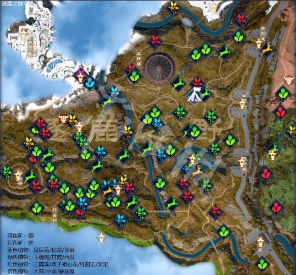 玉橡树的采集位置如图所示,地图上的绿色植物都是可能刷新玉橡树的地点。
