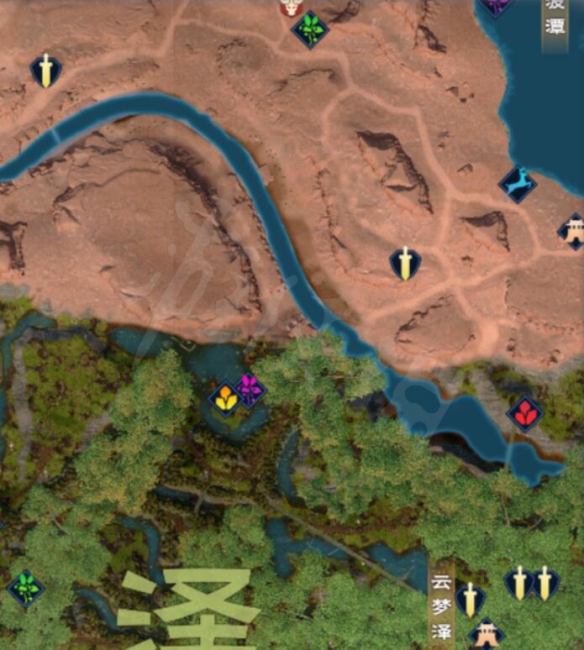 紫莲花可以去大泽水边找,下图中紫色的位置,在木灵族正东方,位于水面上,还是很容易找到的。