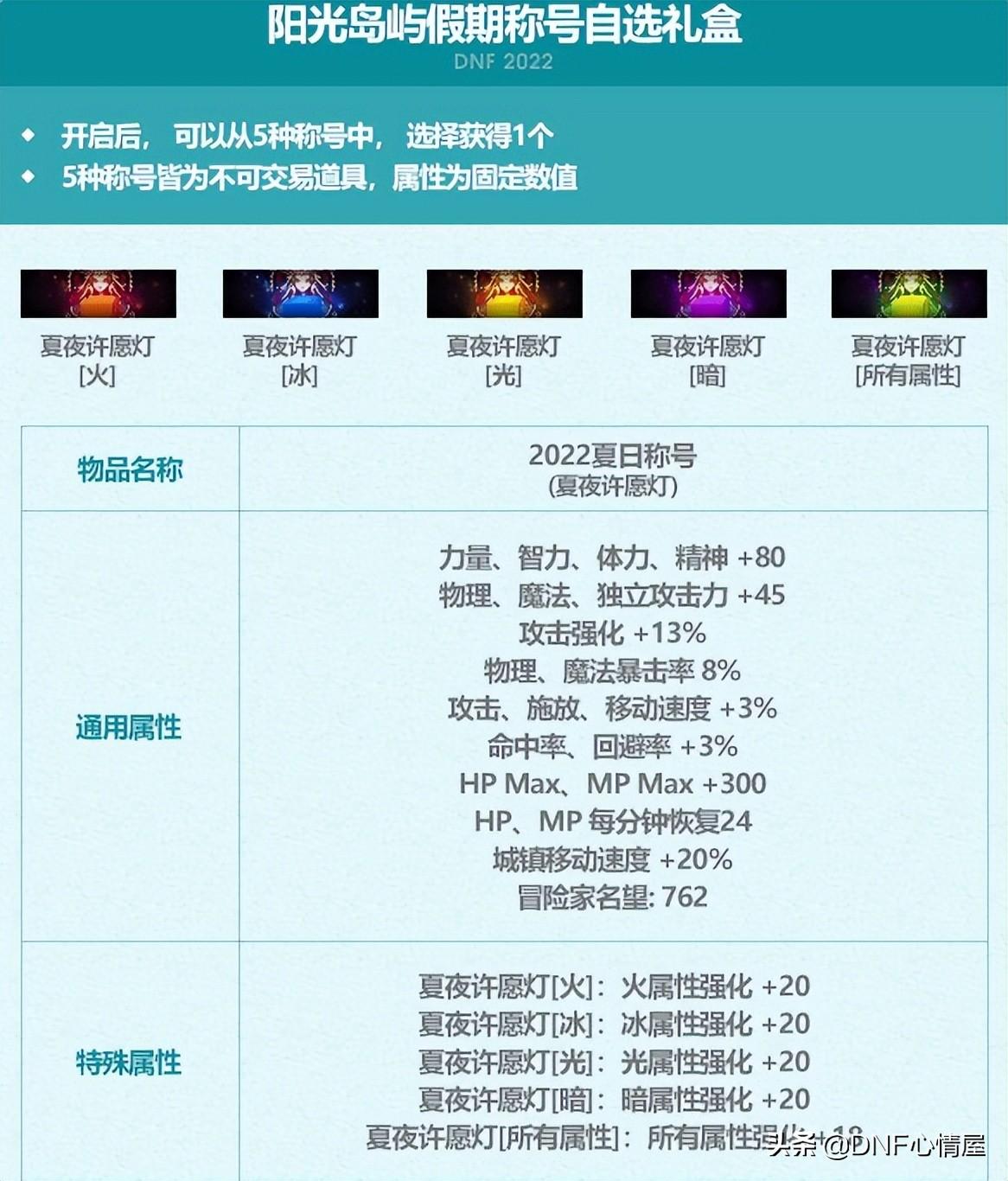 称号有5种可供选择,通用属性都一样,不过特殊属性不同,存在火、冰、光、暗和所有属性。也就意味着,基于玩家所走的属强,夏日称号要针对性选择。