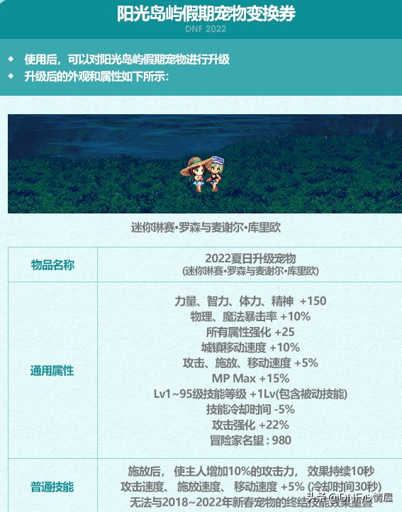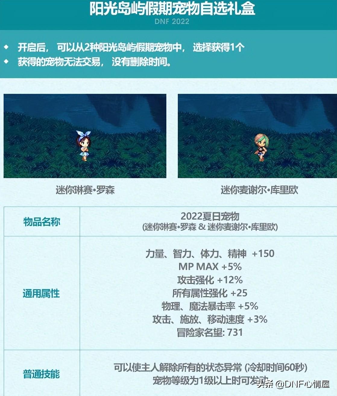 22年夏日阳光岛屿宠物,有2个可以自选,分别是迷你琳赛·罗森和迷你麦谢尔·库里欧,两个在属性方面一样,并没有新春的强势,给没宠物的新晋回归玩家准备的。