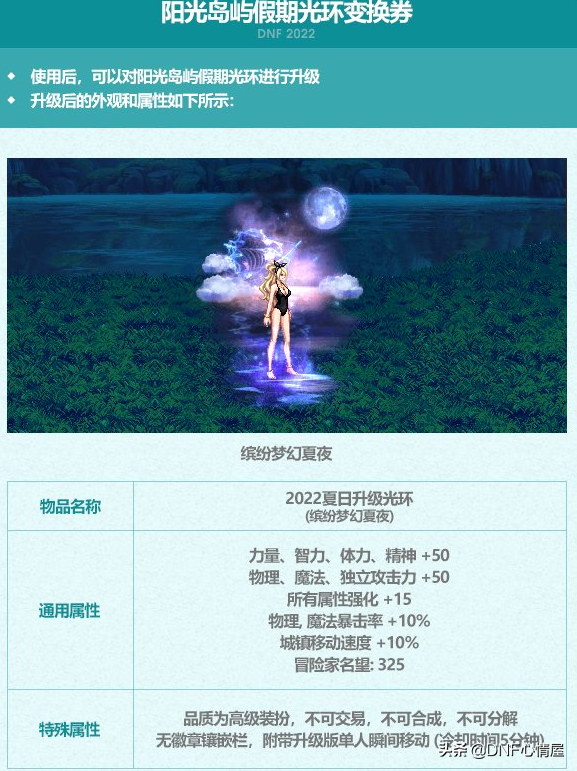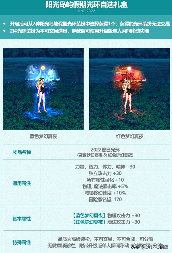 实际上夏日套光环装扮,并非是主打道具,属性方面不是太突出。阳光岛屿光环装扮,有两种外观可供选择,但属性都是一样的。品质为高级装扮,不可交易,不可合成,能够进行分解,无徽章镶嵌栏。