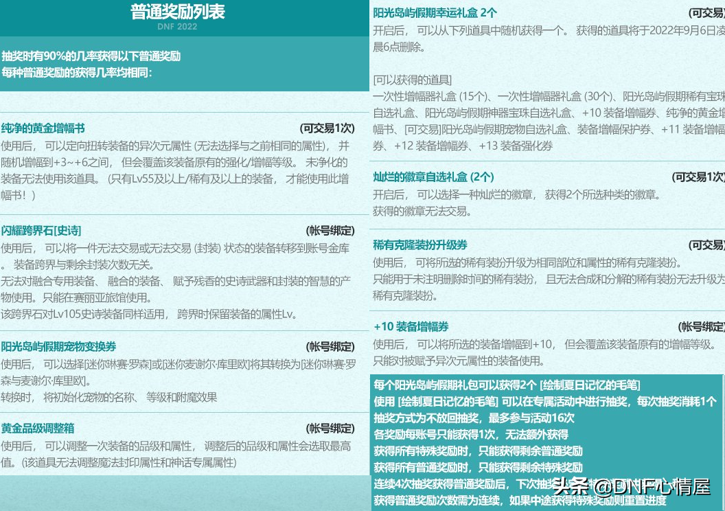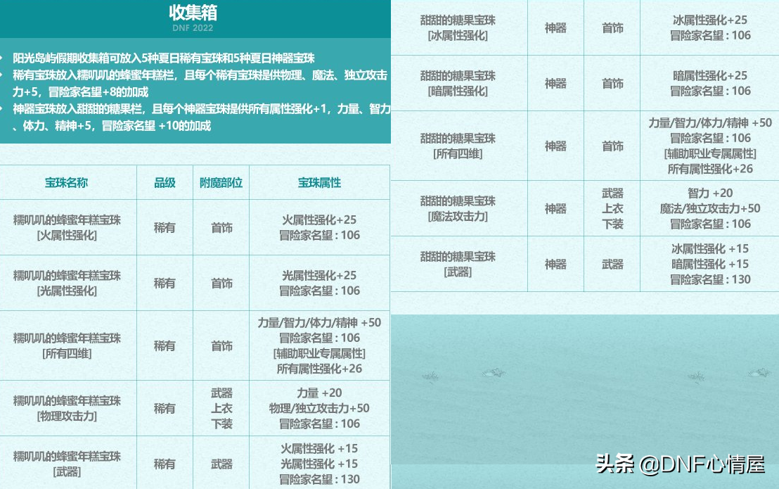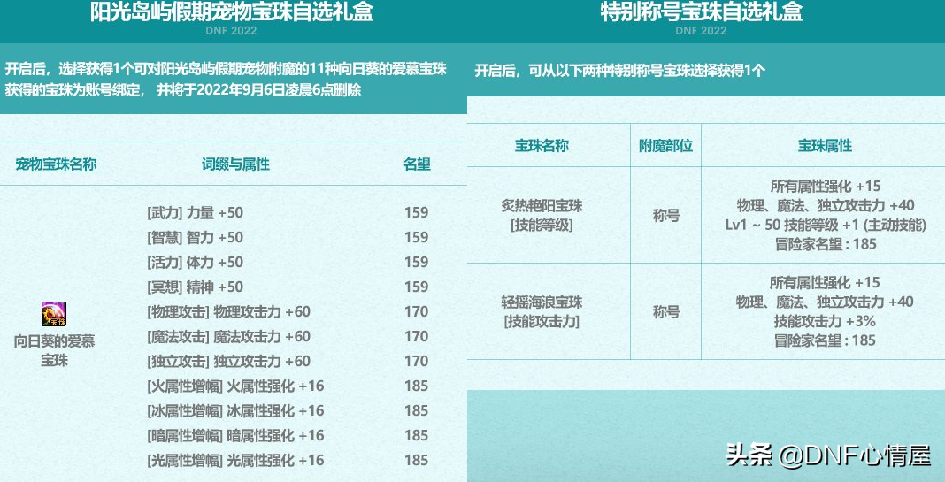 此次阳光岛屿“向日葵的爱慕宝珠”,仅对夏日宠物能赋予,且没有全属性+14附魔。包含了四维+50、三攻+60、冰暗光火属强+16这些宝珠,3个毛笔材料可换自选。