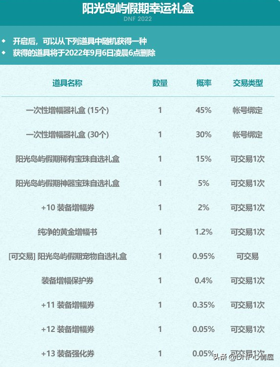 阳光岛屿假期幸运礼盒,能在拍卖行交易,类似“宝物礼盒”,涵盖了多种道具,来供玩家去开。除了一次性增幅器是账号绑定,其余的道具奖励,都是可交易的。