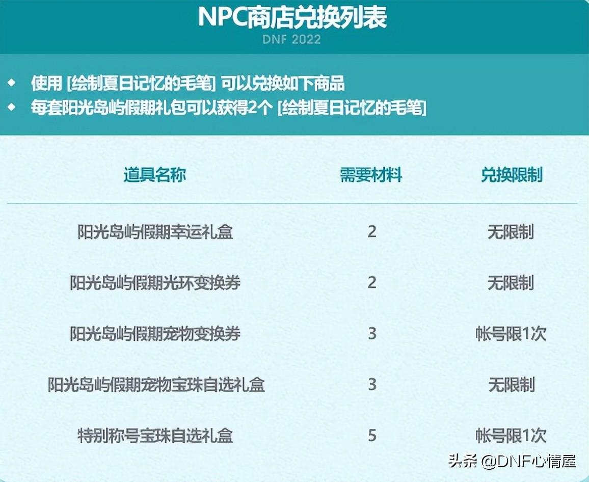 买夏日礼包时,会赠送2个“绘制夏日记忆的毛笔”,在专属的NPC商店,能兑换各种道具。比如阳光岛屿假期幸运礼盒,2个毛笔材料,无限制兑换。